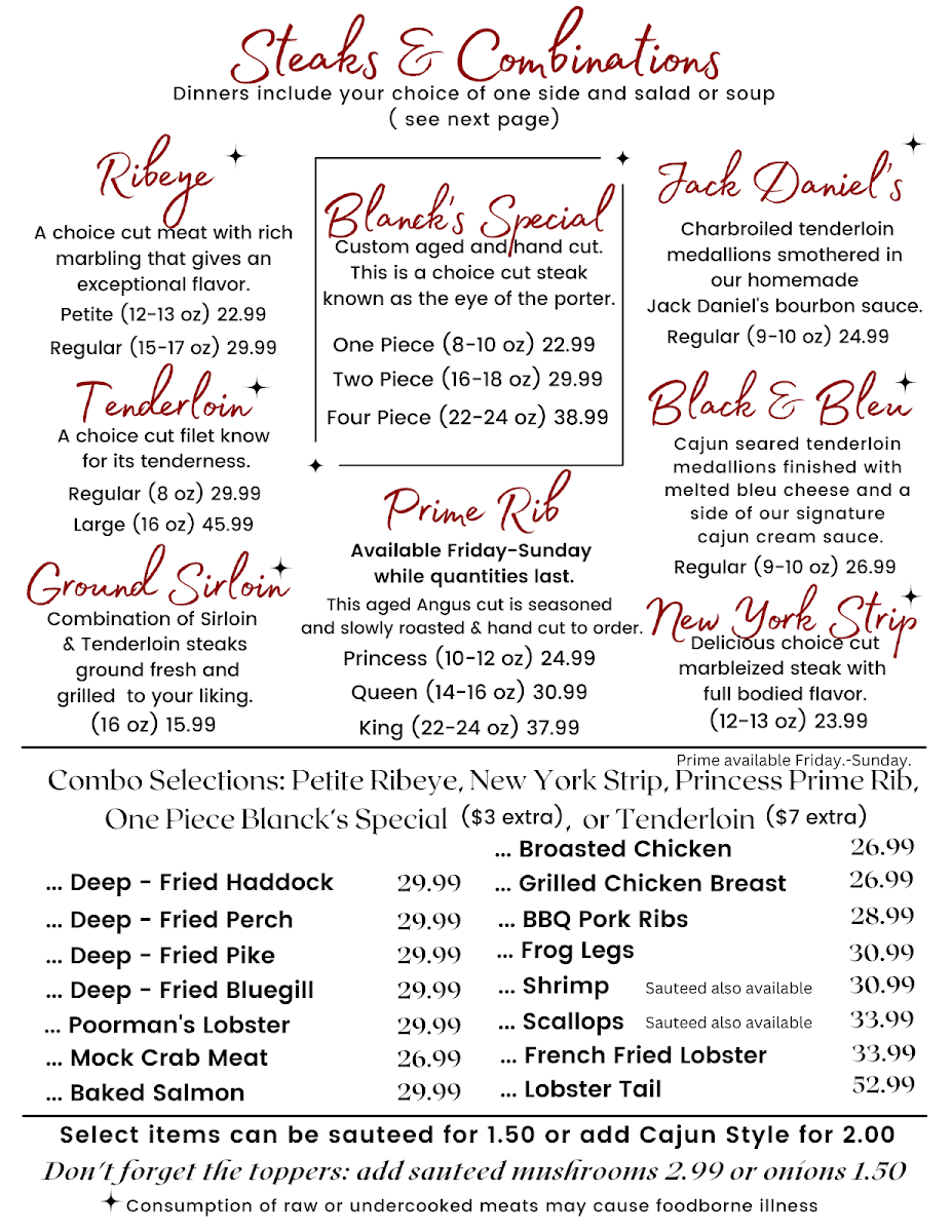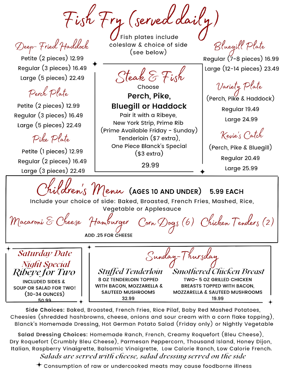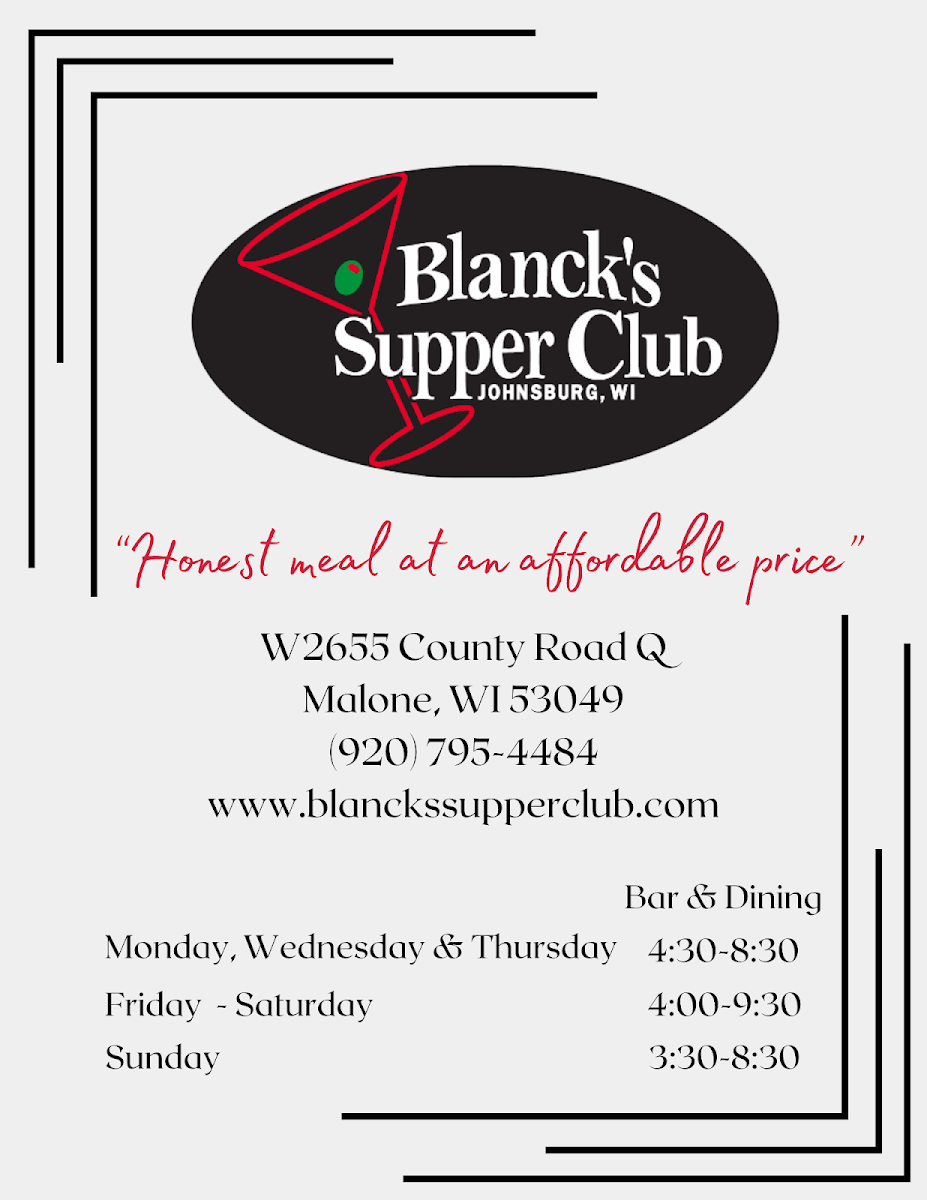 Blanck's Supper Club in Malone, Wisconsin, showcases a classic steakhouse menu with rich Midwestern roots. The standout is undoubtedly their perfectly tender prime rib, praised by many for its melt-in-your-mouth texture and robust flavor. Alongside, dishes such as New York Strip and tenderloin medallions offer a refined, juicy experience that meat lovers will appreciate. The menu also embraces comfort with appetizers like crispy mozzarella sticks, boneless chicken wings, and savory cheese curds, paying homage to Wisconsin’s famed cheese culture.