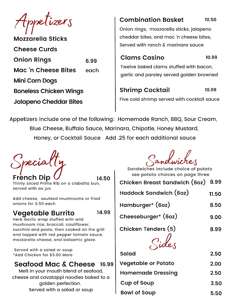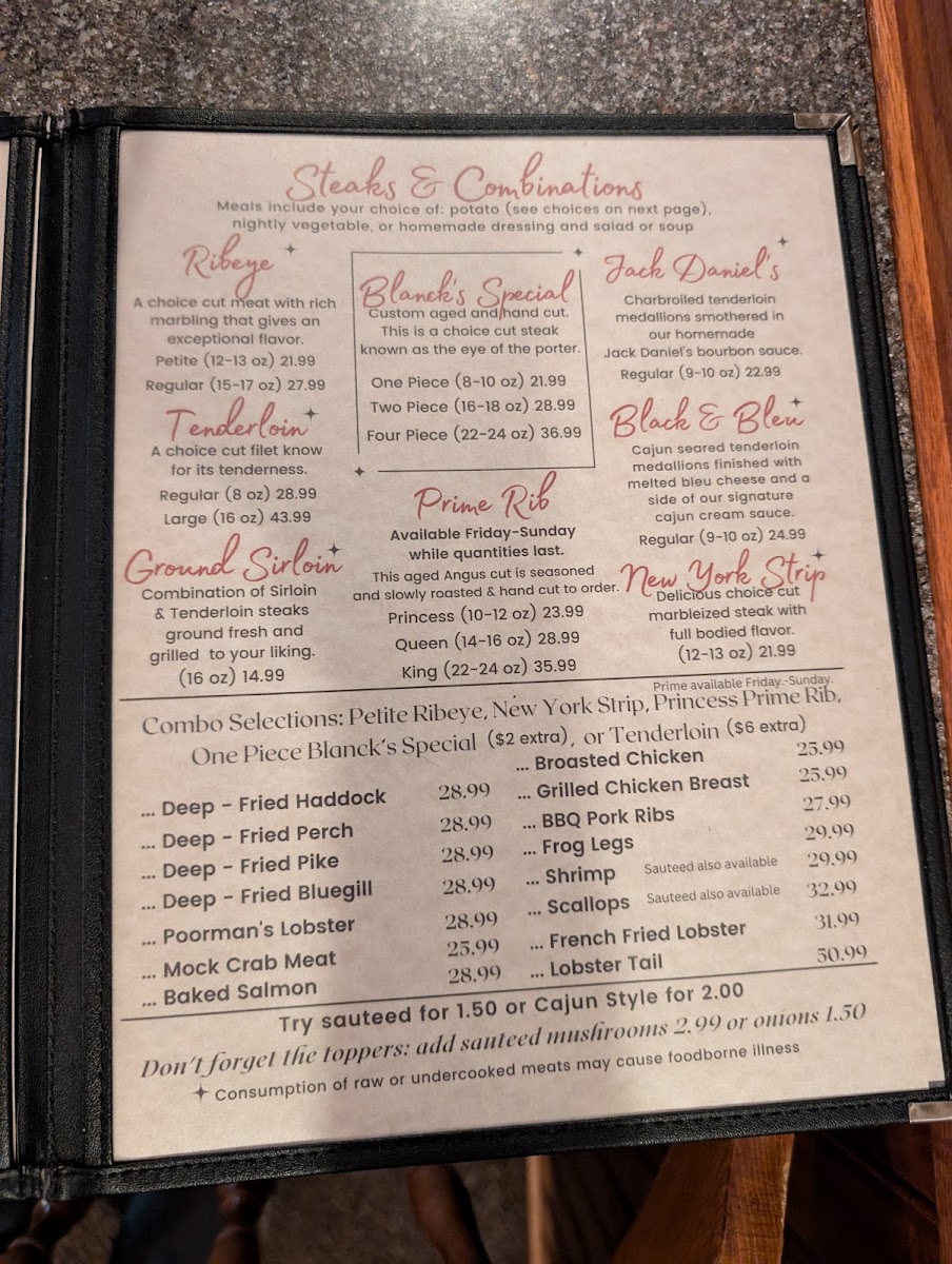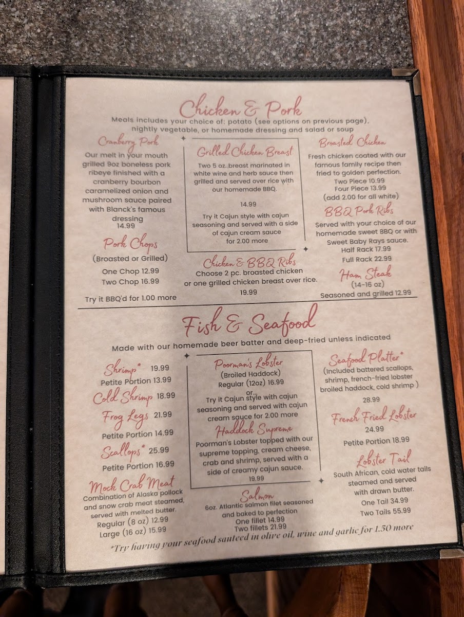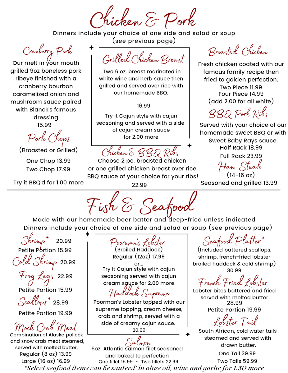 Blanck's Supper Club in Malone, Wisconsin, showcases a classic steakhouse menu with rich Midwestern roots. The standout is undoubtedly their perfectly tender prime rib, praised by many for its melt-in-your-mouth texture and robust flavor. Alongside, dishes such as New York Strip and tenderloin medallions offer a refined, juicy experience that meat lovers will appreciate. The menu also embraces comfort with appetizers like crispy mozzarella sticks, boneless chicken wings, and savory cheese curds, paying homage to Wisconsin’s famed cheese culture.